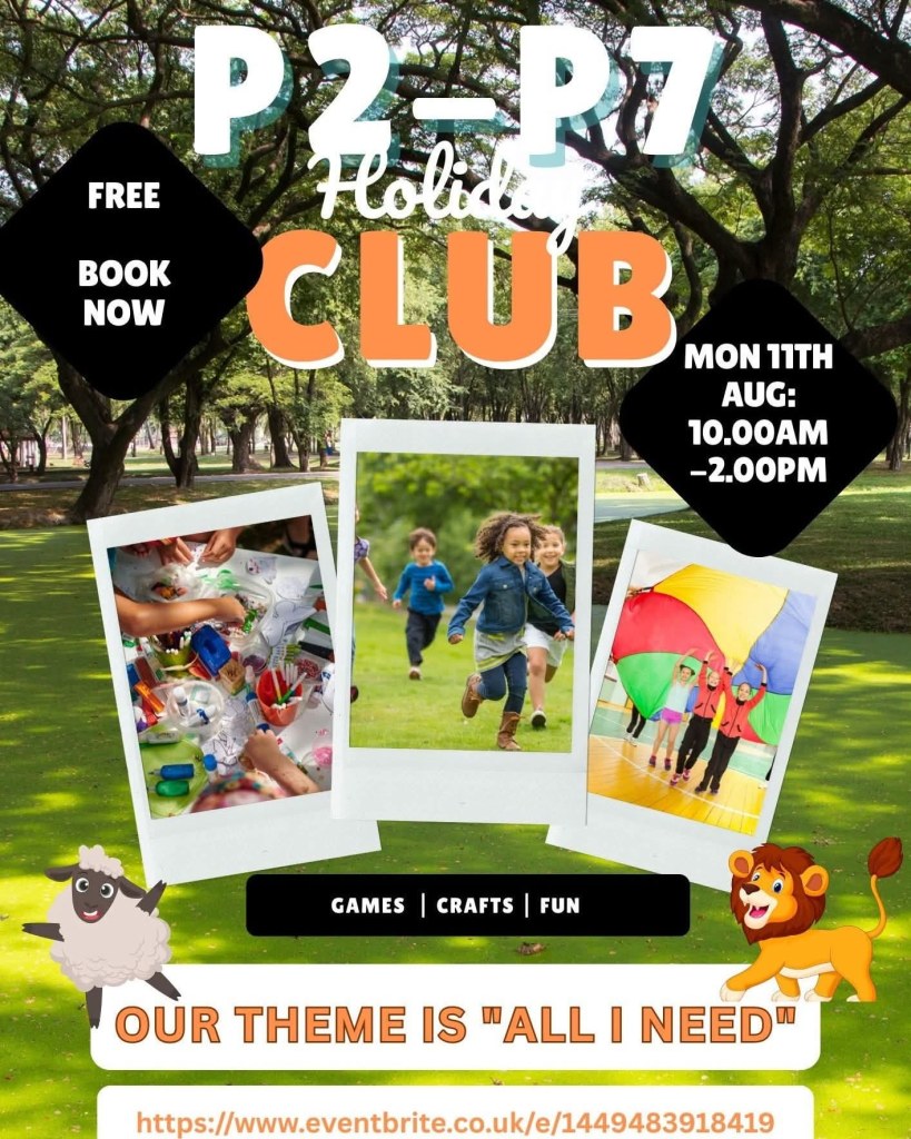 Our PVG-cleared team here at Shawlands Trinity Church are running a free holiday club for children in P2-P7 on Mon 11th August 10.00am-2.00pm in our Sanctuary and hopefully gardens, weather permitting, on the theme of ‘All I Need’.