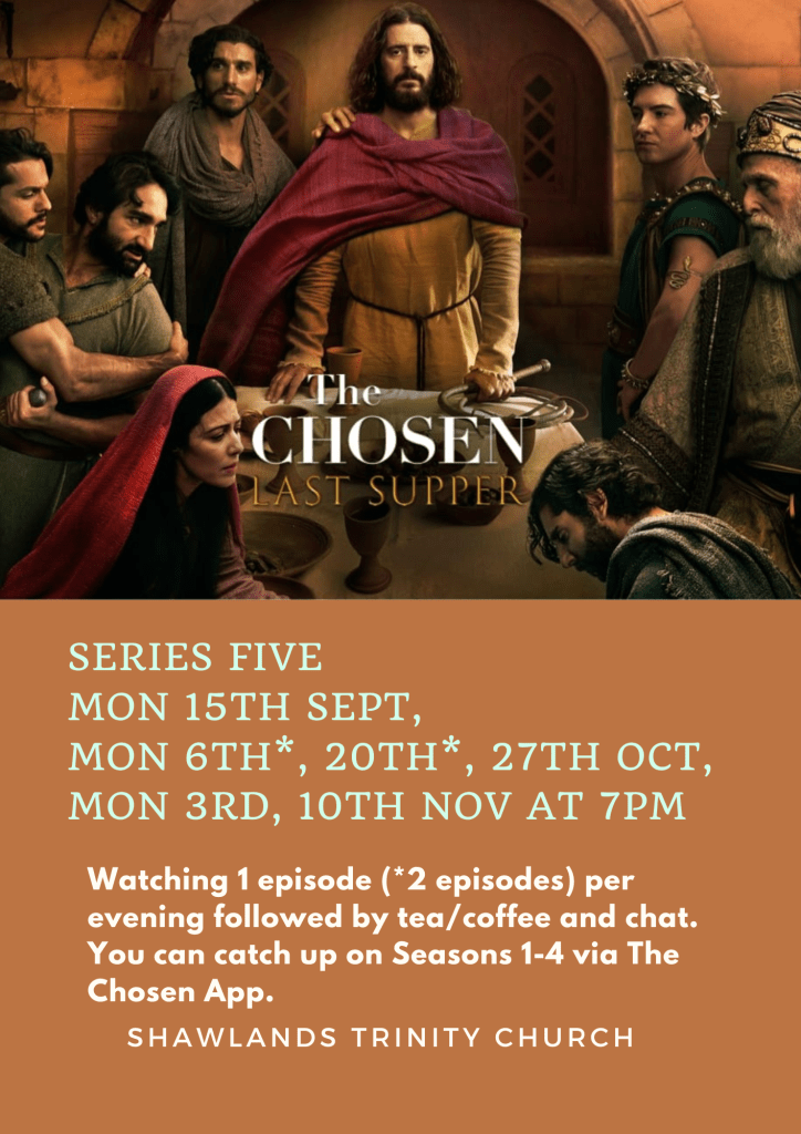 Our Monday evening sessions watching The Chosen followed by tea/coffee and chat resumes on Monday 15th September at 7pm in the Youth Room.