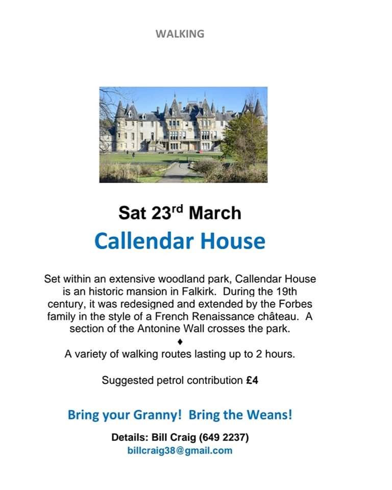 Our Walking Group are starting their 2024 walks with a trip to Callander House on Sat 23rd March. Please contact Bill for more details.