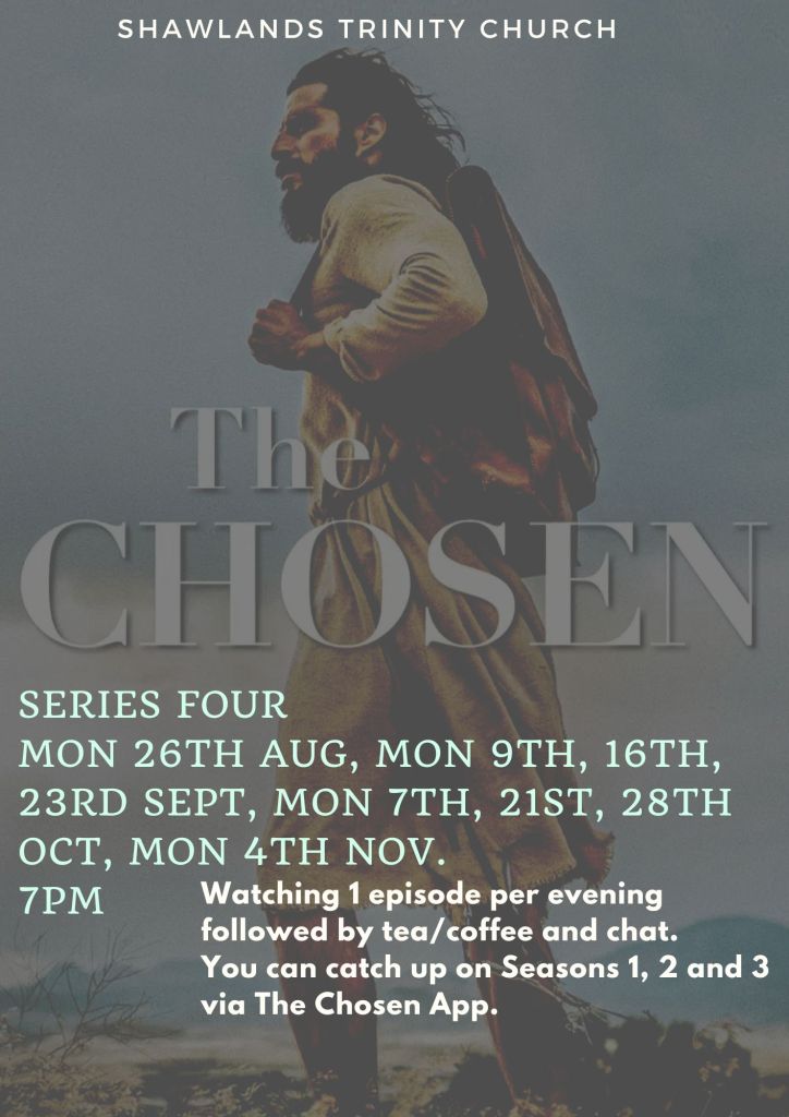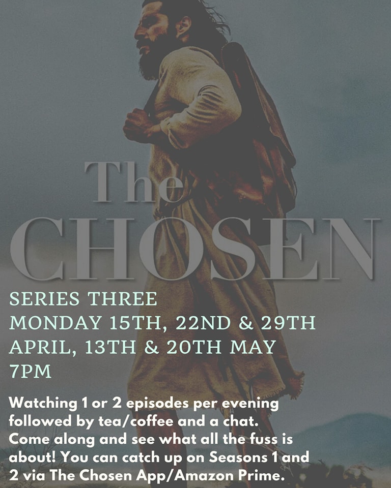 Our Monday evening sessions watching The Chosen followed by tea/coffee and chat, resume on Monday 26th August at 7pm in the Youth Room.The episodes are longer this season so we are planning on watching one per week. Please join us.