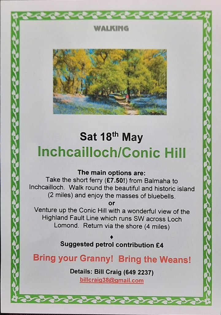 The next walk will be Strathyre on Saturday 5th Oct. Transport available. Please contact Bill Craig billcraig38@gmail.com for details.