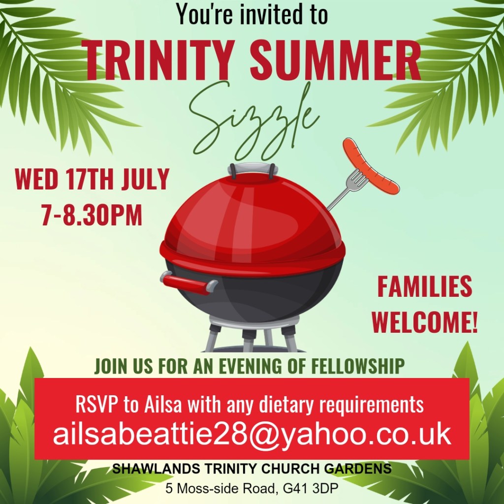 Midweek Meditation returns for six weeks commencing Wed 1st May. This is a short time of prayer and meditation each Wednesday in Shawlands Trinity Church at 12.00 noon. All welcome. Hope you can make it along and spend some quiet time with the Lord, getting to know each other a little better, too.
