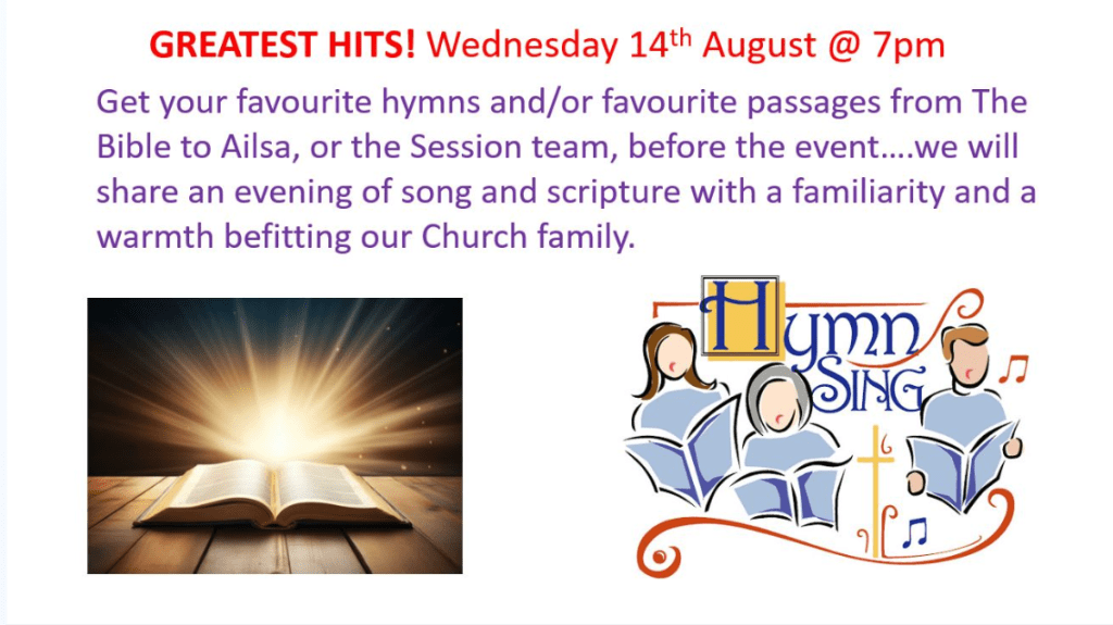 Join us in the Sanctuary – all welcome. You can contact Ailsa Beattie in person or via email on ailsabeattie28@yahoo.co.uk with your requests or pass them to a member of the session team.