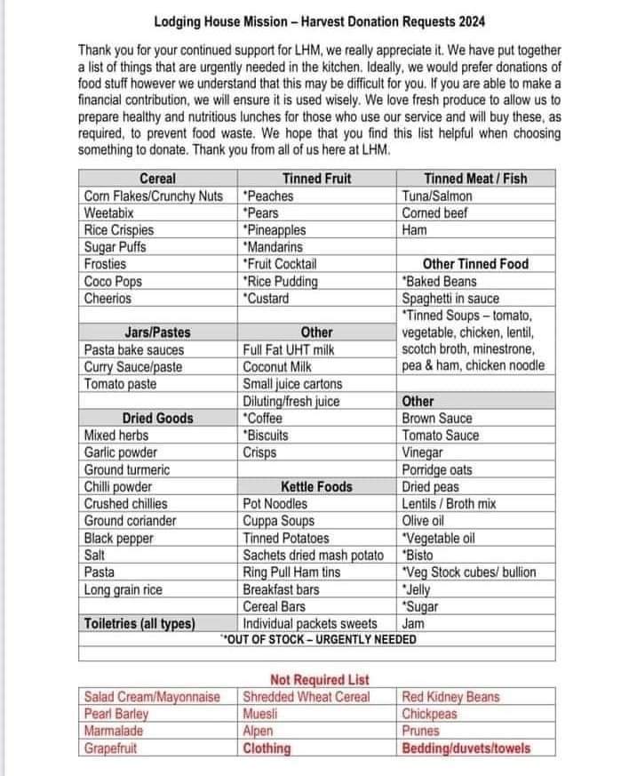 Our Harvest Service will take place on Sunday 6th October and we will be collecting donations for The Lodging House Mission. Please read their requests. There will also be envelopes available if you wish to make a monetary donation.